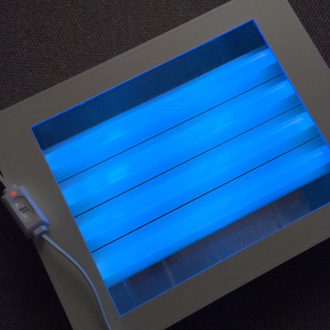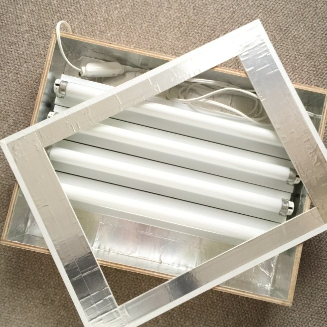 昨年暮れに、サイアノに詳しい方に露光機の実物を見せてもらい、いろいろと参考にさせてもらった。まず大切なのはできるだけ露光面と光源の距離を近くすること。それから内側は銀レフとしてアルミテープで覆った方が良いこと。紫外線は白レフではあまり反射効果が期待できないらしい。ゲレンデで雪焼けするのは、おそらく積もった雪は白レフじゃなくて銀レフに近い効果があるからかな、と今思った。白銀の世界って言うくらいだしね。どうなんだろう。
