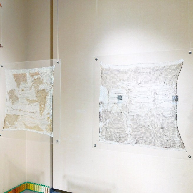 額装されたニット作品の脇にある小さなアクリル貼りのキャプションが親であり、ニットが子供。まさに目玉のおやじ的な親子関係。テキスト、画像、ニットの循環が目眩がしそうなほど楽しい。
