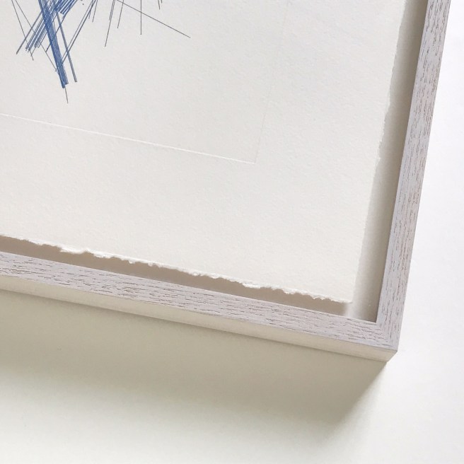 まずは「耳付き」を活かすため、プリントにはオーバーマットを被せずにフローティング仕様に。版画の用紙は四辺を裁断していない耳付きの紙が好まれる。イメージサイズに合わせてカットする場合も、手でちぎるなどしてムラを作ることが多い。版画は紙の厚みや繊維質など、微細な物質感も作品の魅力の一部になっているので、耳を活かすのも大切なポイント。