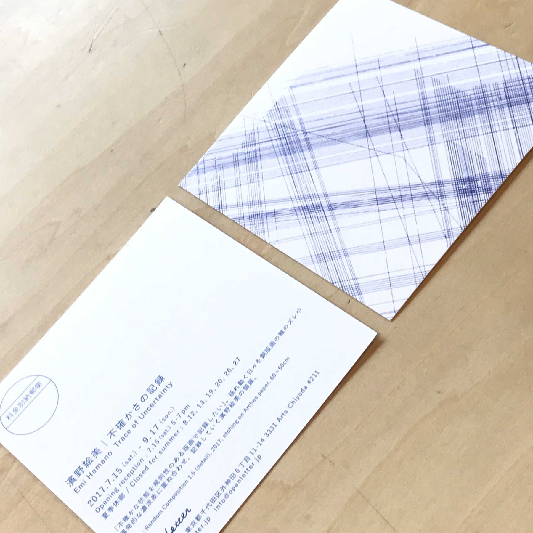 濱野さんの銅版画はエッチング技法で製作されている。青インクを基調色として用い、線の集積によるストイックな幾何学的模様が特徴だ。その執念ともいえる作業とは裏腹に、アルシュ紙に定着した青い線分はどこまでも目に優しく届いてくる。ずっと飽きることなく見ていられる作品だ。