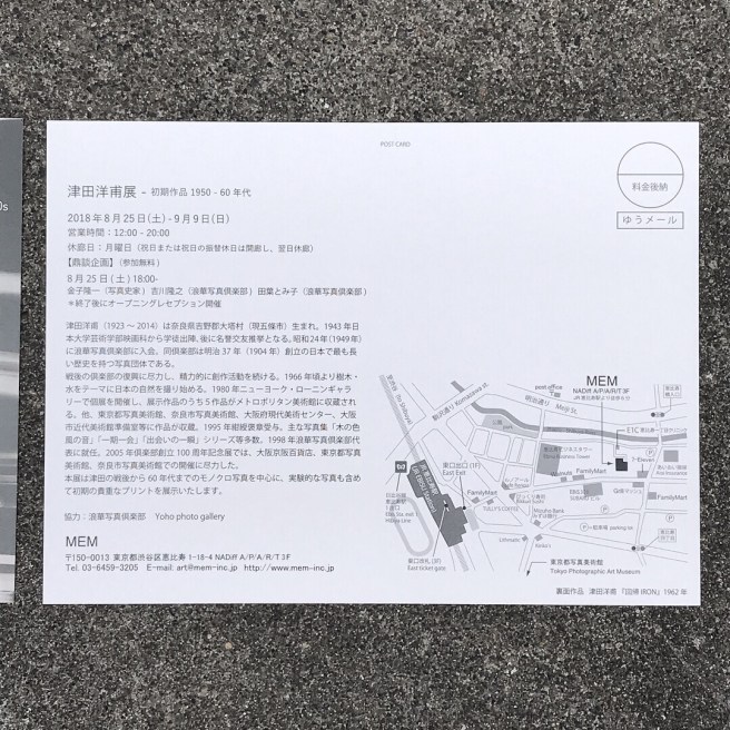 津田洋甫は66年以降は作風を大きく変え、日本の自然をテーマに撮影をしており、今回の初期作品は戦後の新興写真の流れを色濃く残す貴重なプリントだと思う。MEMは埋もれてしまった作家や作品を掘り起こして、再評価をしてゆく取り組みも魅力で、未見の作家と出会える絶好の空間になっている。